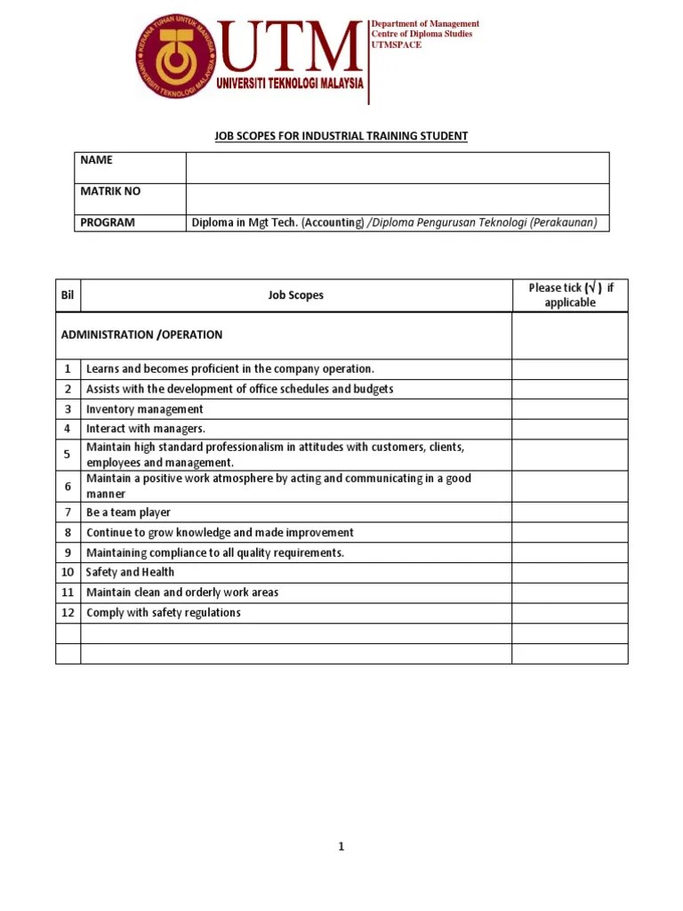 Skop kerja latihan industri diploma pengurusan teknologi perakaunan expense taxes. Maka dengan itu,latihan industri merupakan sebahagian daripada kursus wajib yang perlu diambil oleh semua . Pelajar disyaratkan lulus latihan industri sebelum diperakukan untu penganugerahan sijil atau diploma politeknik kptm.